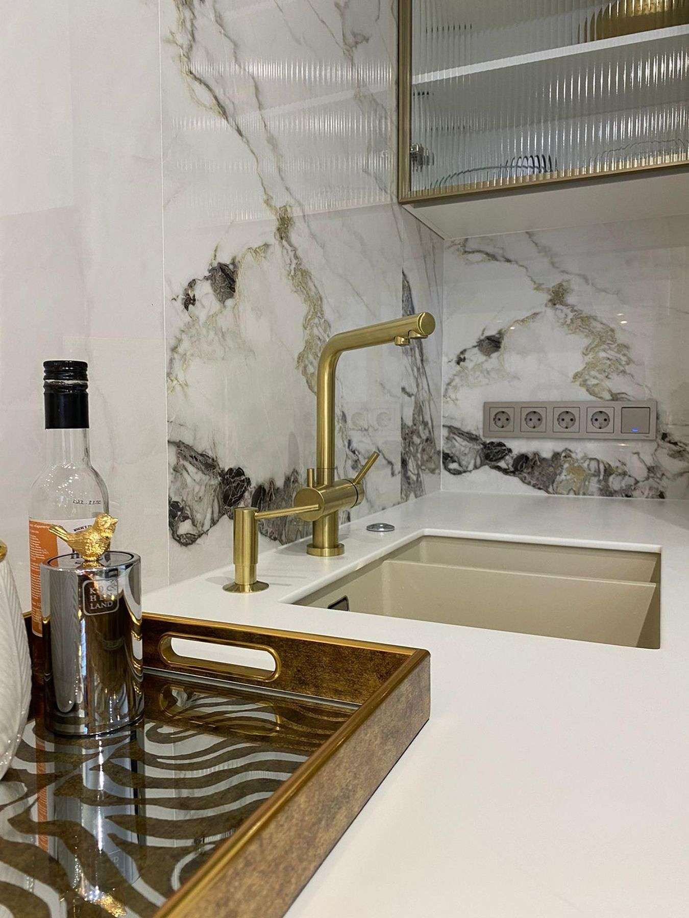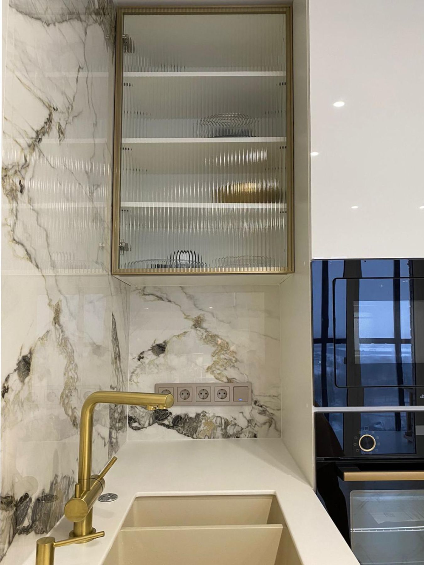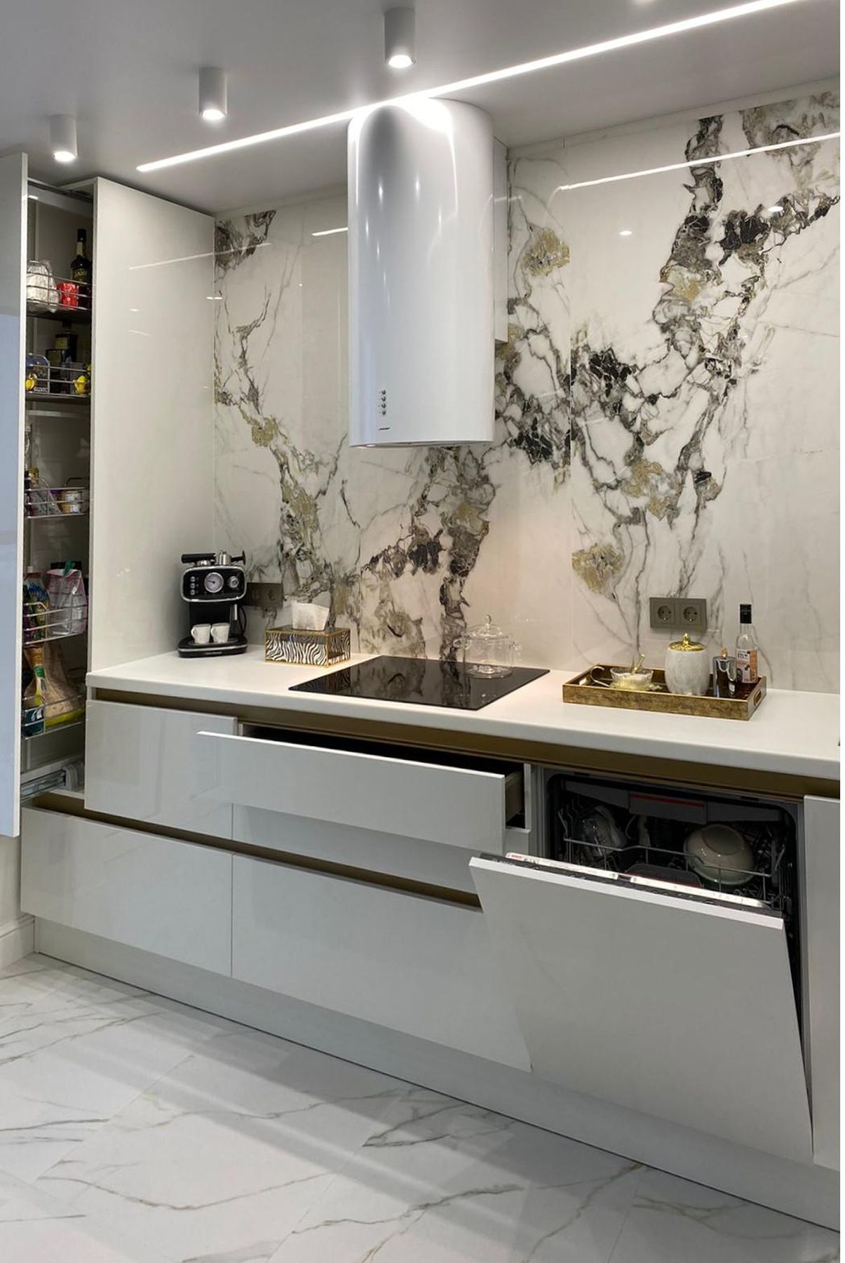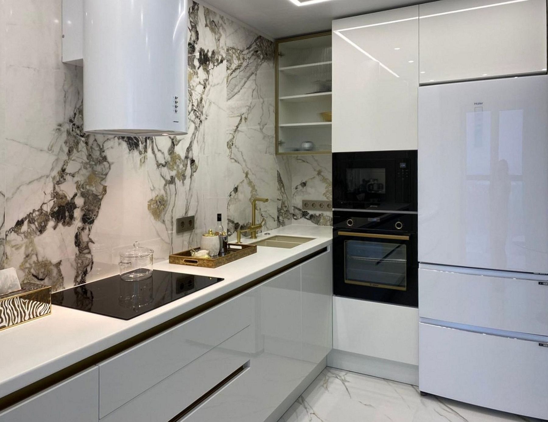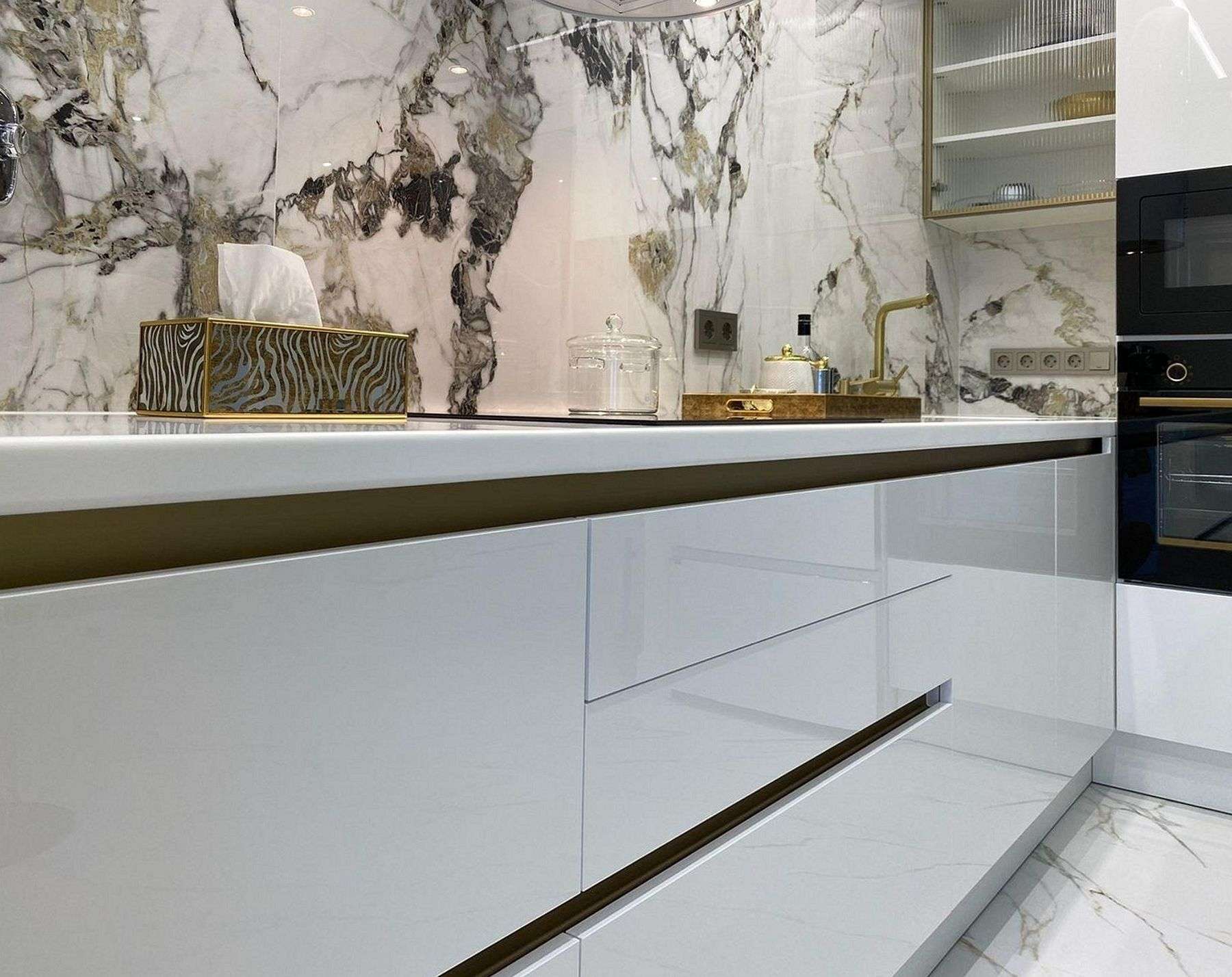 Белая глянцевая кухня в стиле минимализм с золотой фурнитурой