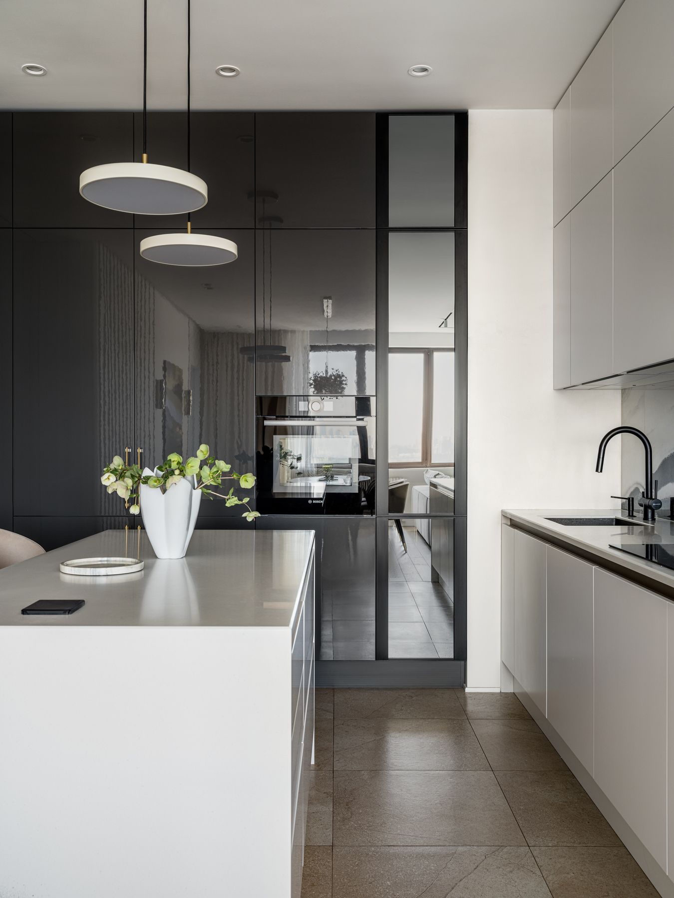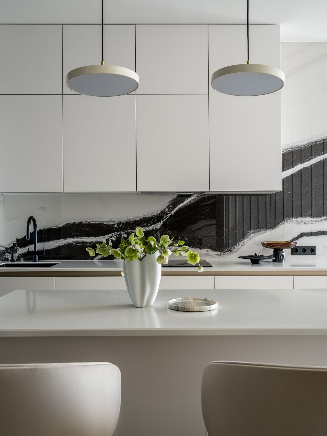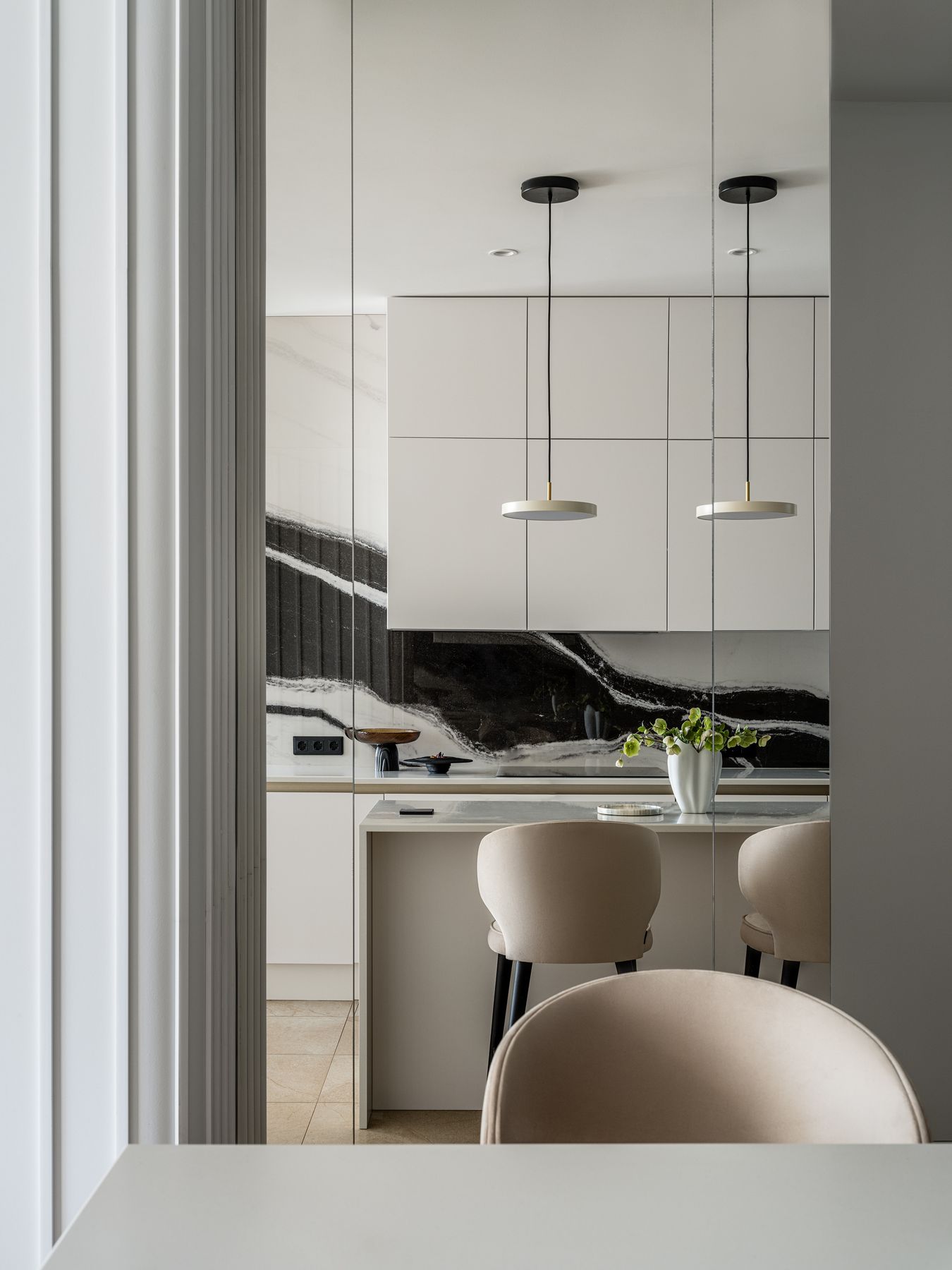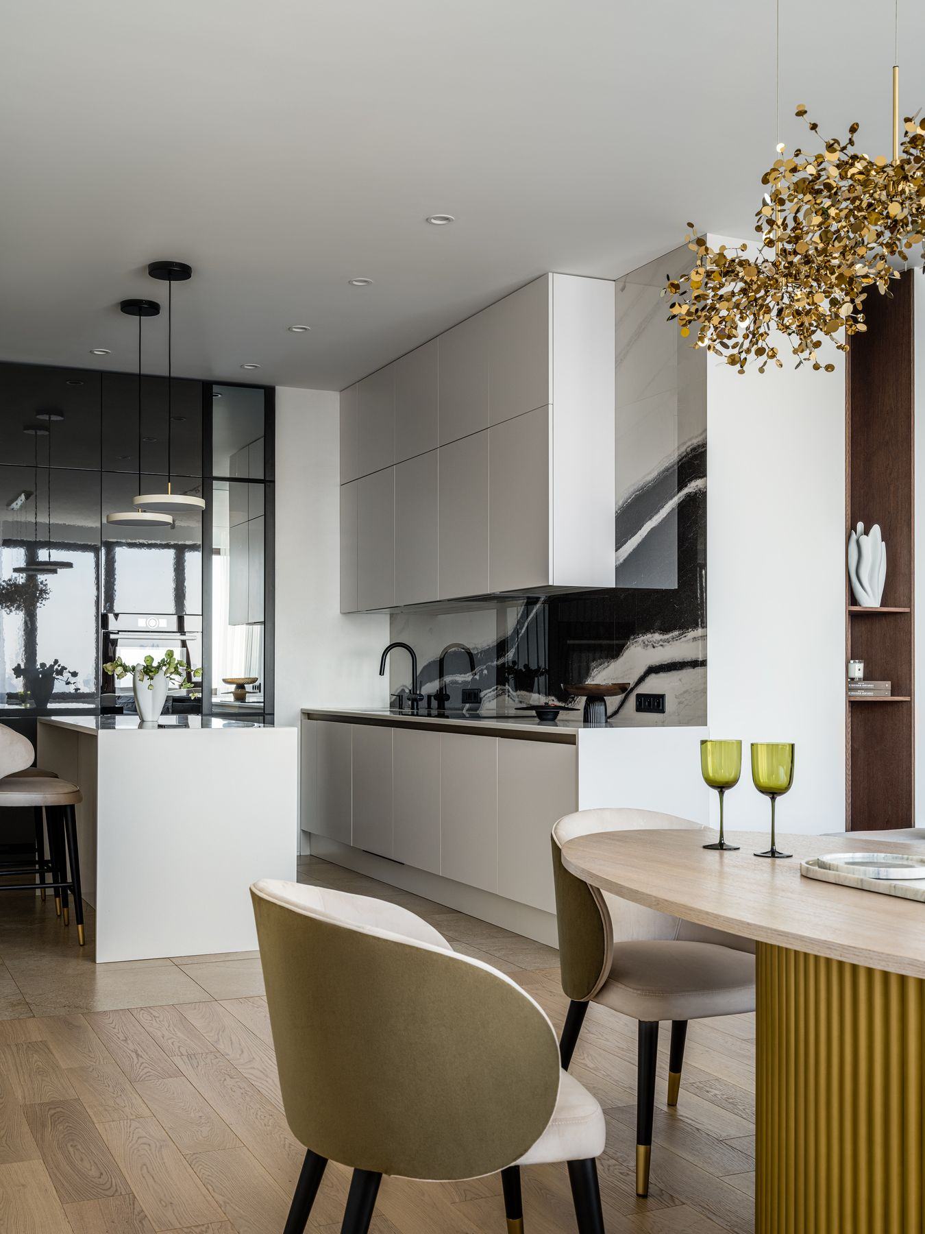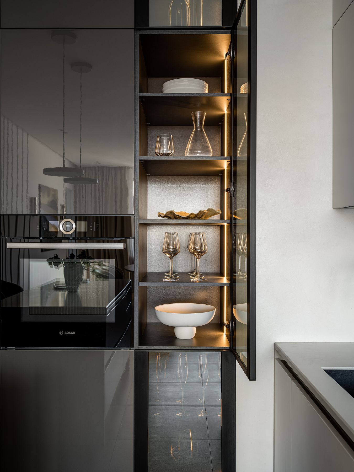 Поскольку кухня является частью общей зоны с гостиной, мы уделили особое внимание ее эстетике. Эффект «парадности» и лоска был достигнут за счет глянцевых фасадов, выразительного фартука и декоративной колонны с витриной и подсветкой. Это решение добавило интерьеру глубины и света, сохранив при этом общую лаконичность и ощущение простора. В результате кухня стала не только функциональным центром для семьи, но и стильным акцентом всего жилого пространства.