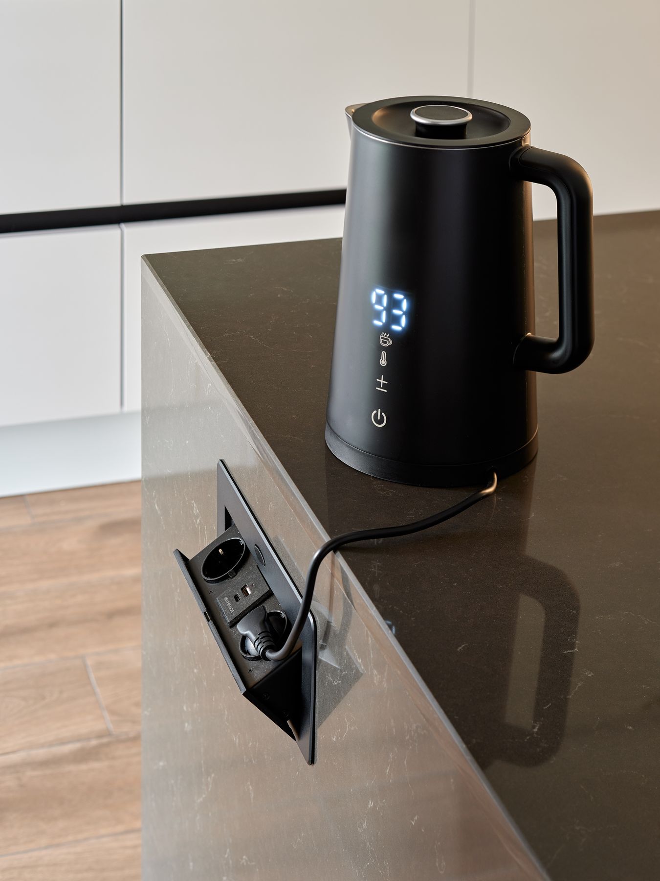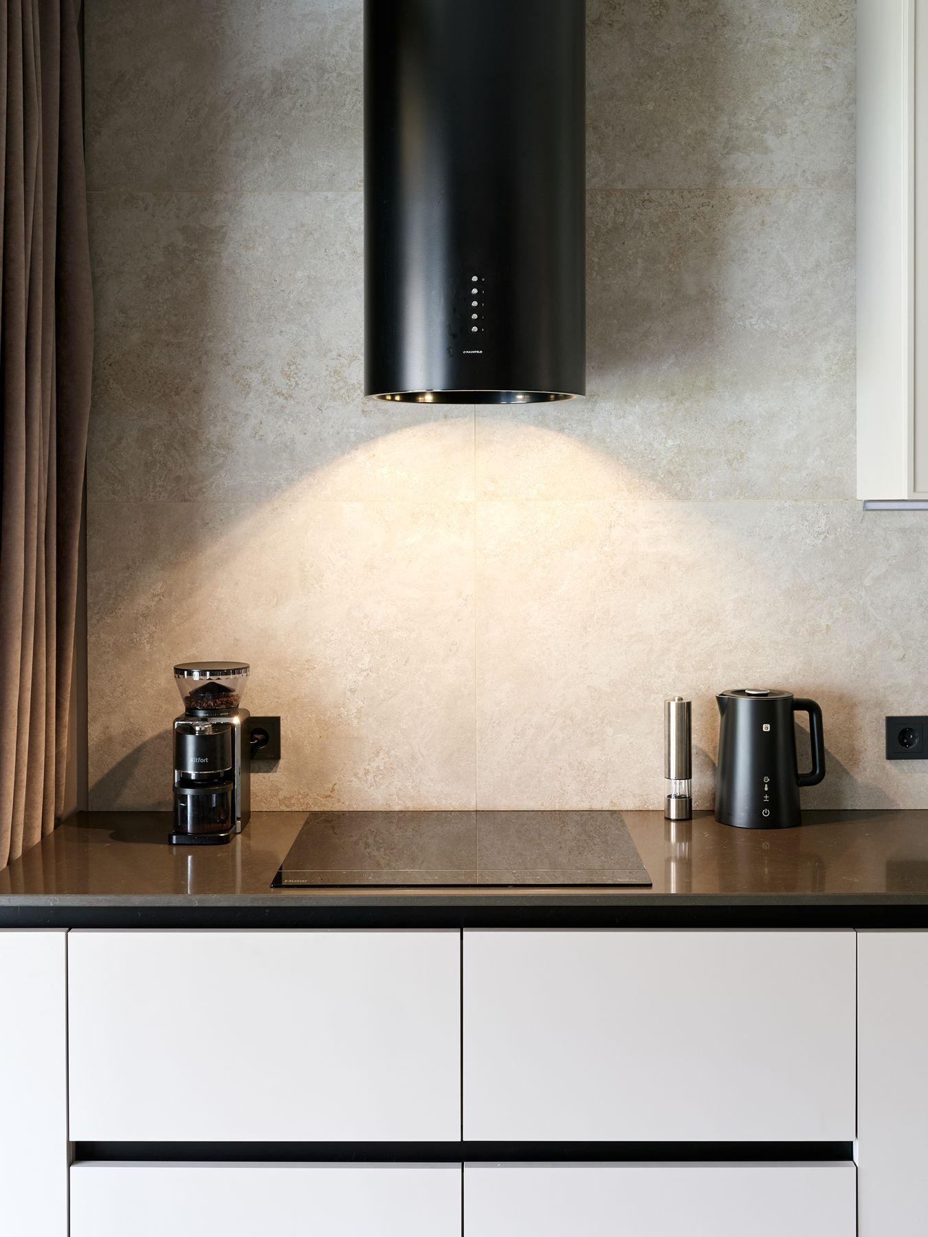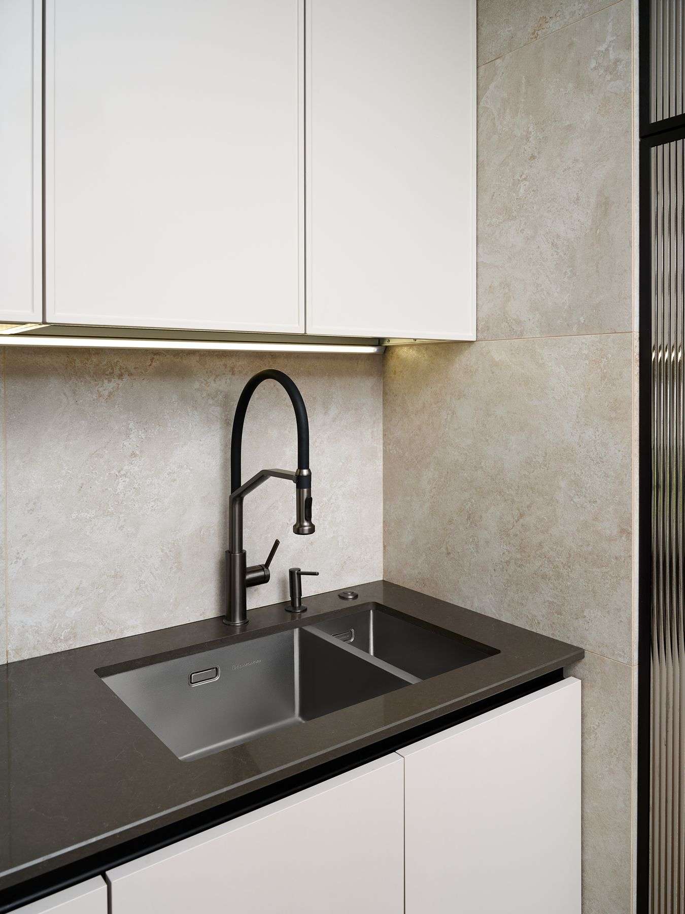 Оттенок фасадов «кашемир» привлек своей универсальностью: он гармонично сочетается с различными цветами и материалами. Темная поверхность кварцевой столешницы оттенка «Уральские горы» в сочетании с фасадами создает выразительный контраст.