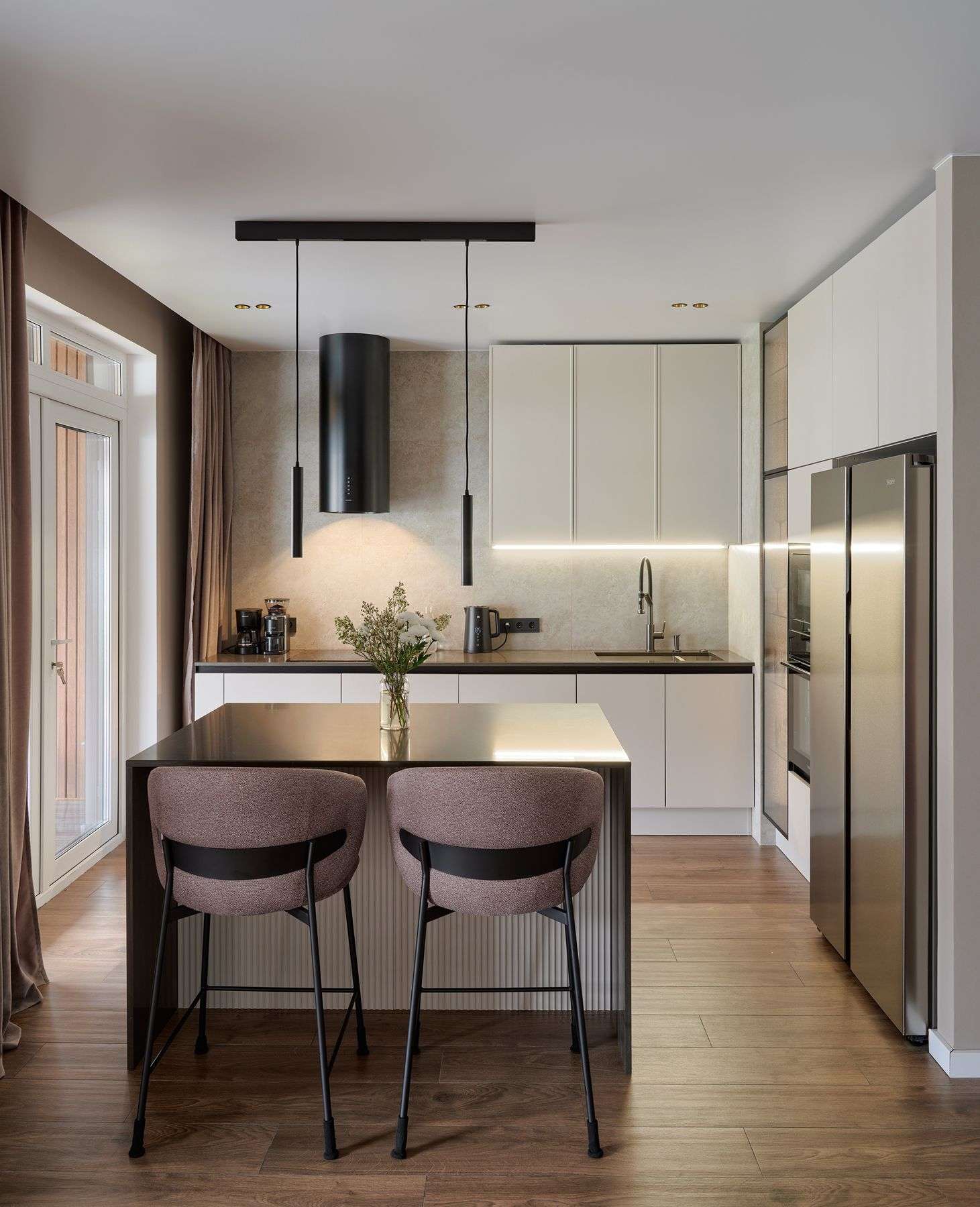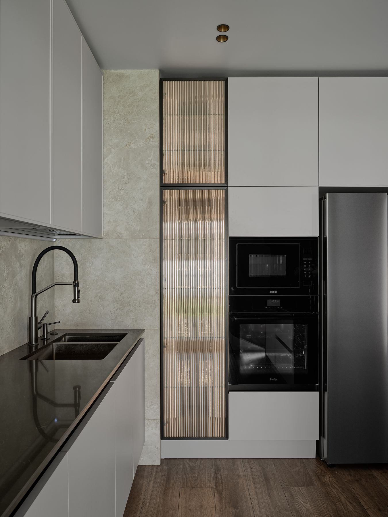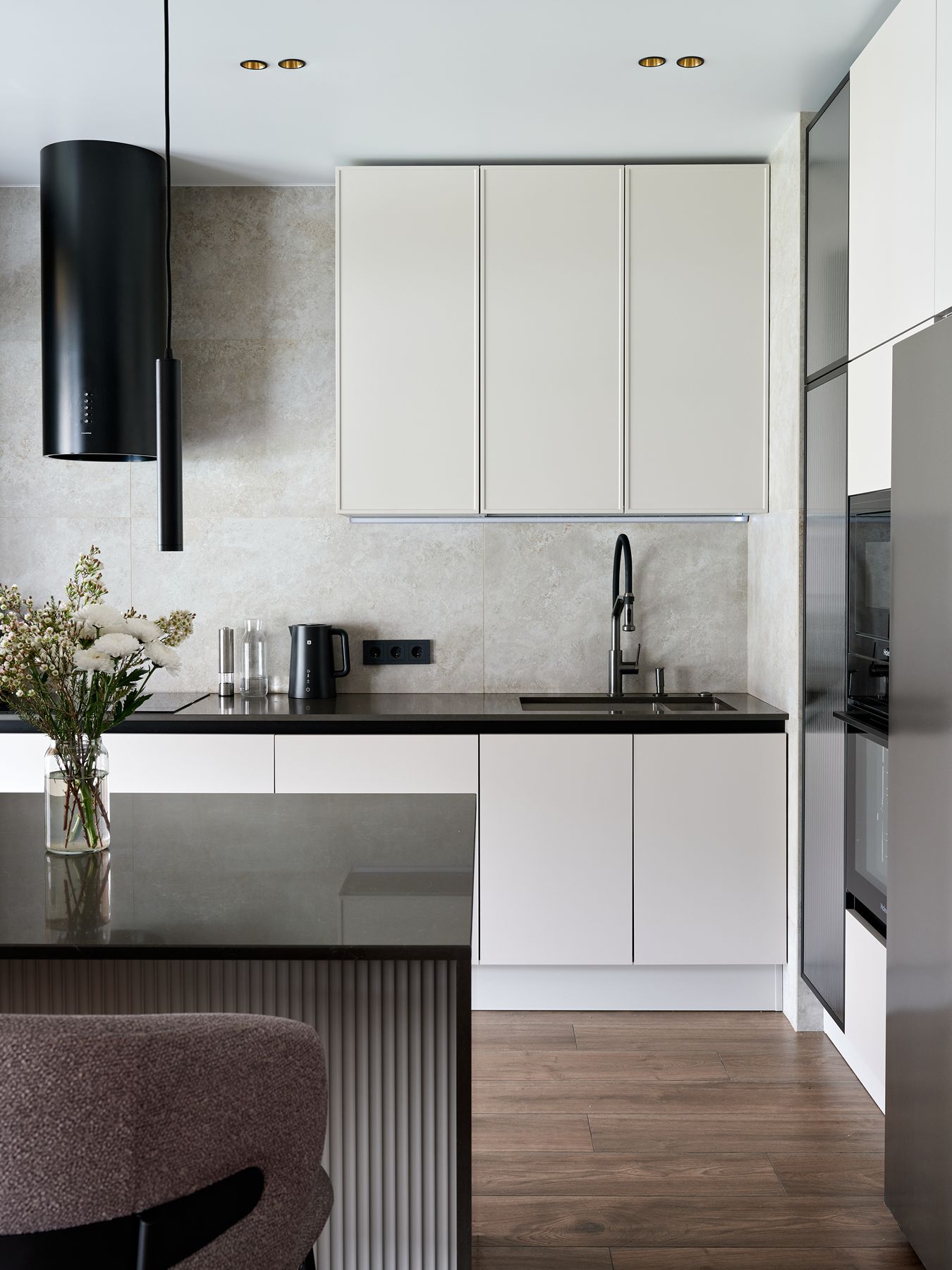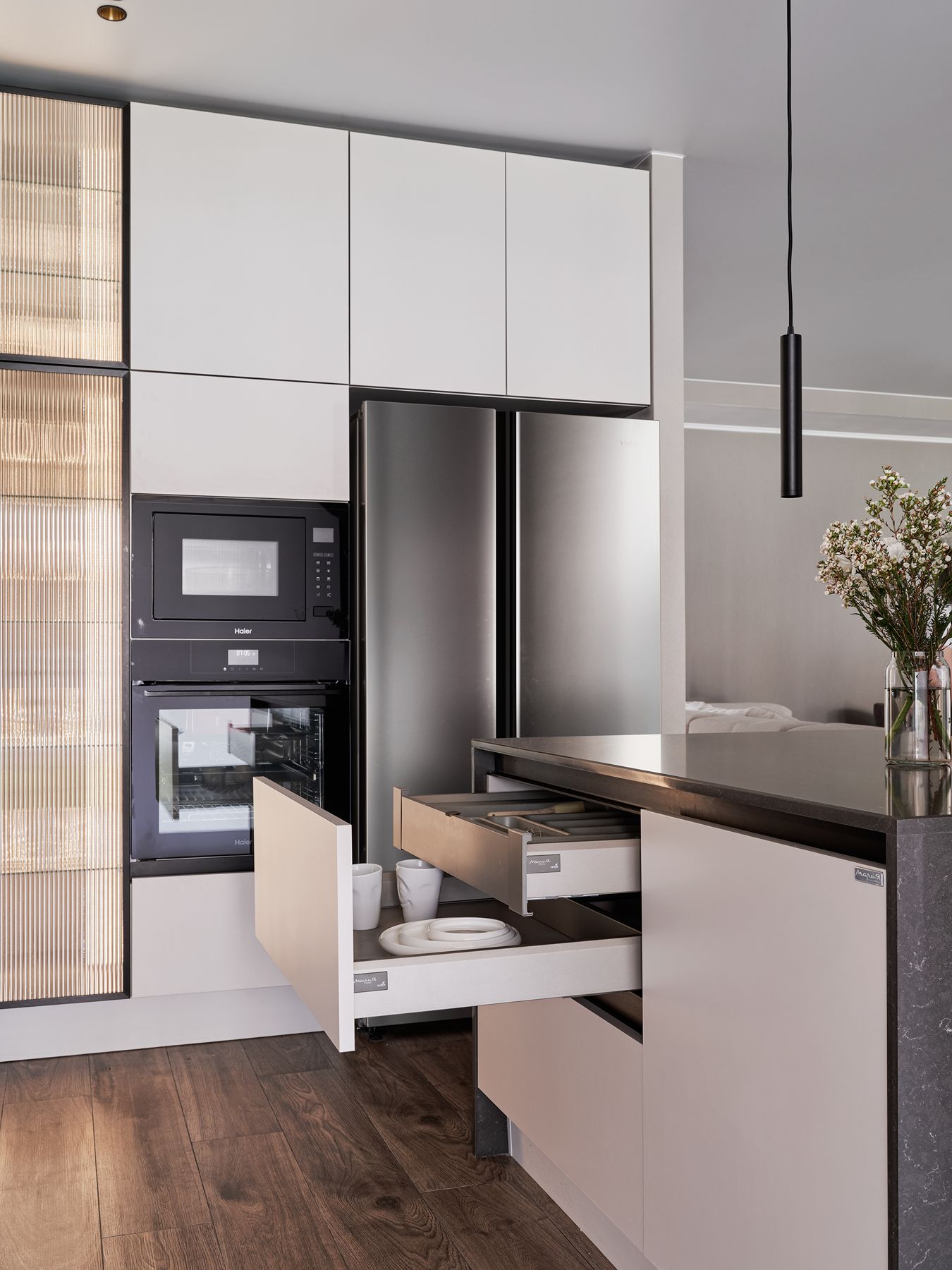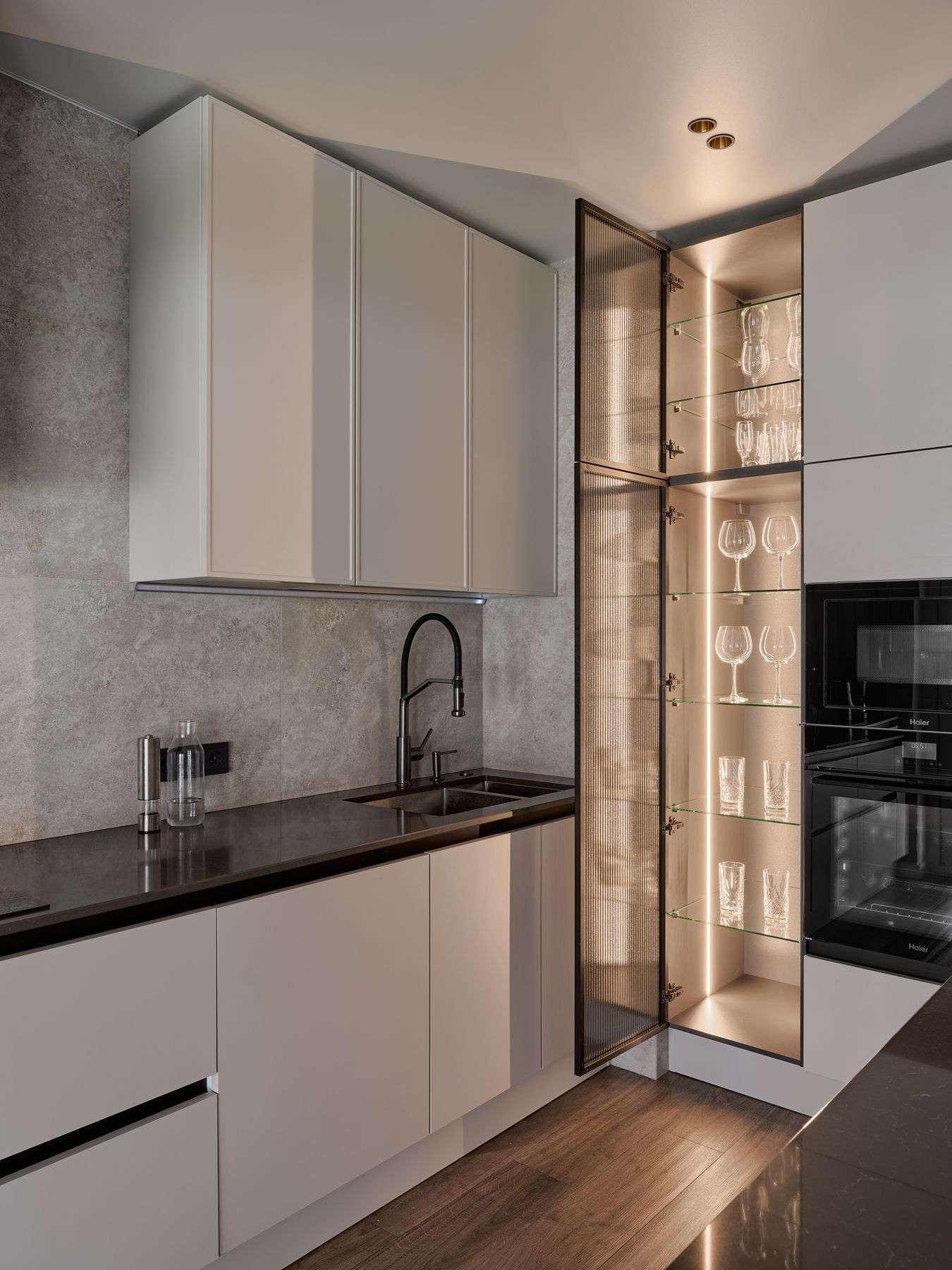 Помимо эстетики, кухня отличается превосходной эргономичностью. Пространство позволяет разместить всю необходимую бытовую технику, а многочисленные системы хранения обеспечивают максимальную функциональность.